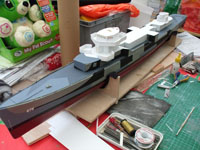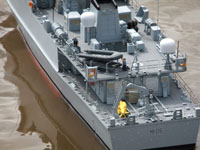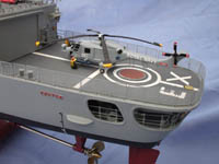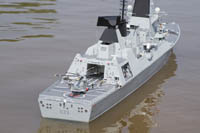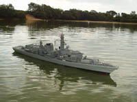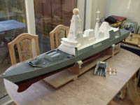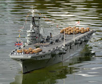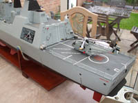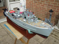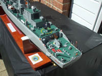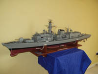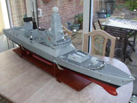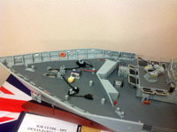 I started the build in Nov 2008 and only 9 months later had built the model. She has 186 lights, red and white, working anchors, two working radars, smoke unit, rotating helicopter with sound, Morse code lights with sound, plus the band of the Royal Marines come up on the front flight deck playing Soldiers of the sea, Life on the ocean wave, and Sunset. In addition,a fighting attack roll plau show which last's about 8 minutes.