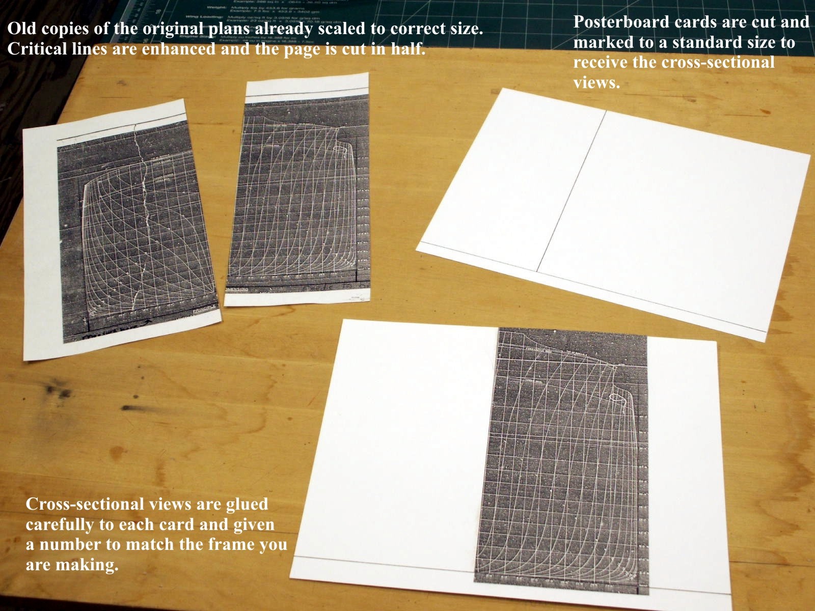 If you are not ready to throw up your hands and walk away by now you probably will be by the time the next part is done. Again, if you have a really great set of well-drawn accurate plans for the bulkheads then you are set. Take your cross-sectional view to the copy shop and make as many copies of it as there are bulkheads, plus a few extra for mistakes. Cut your poster board into standard sized squares, and mark each with a true baseline and perpendicular centerline.
