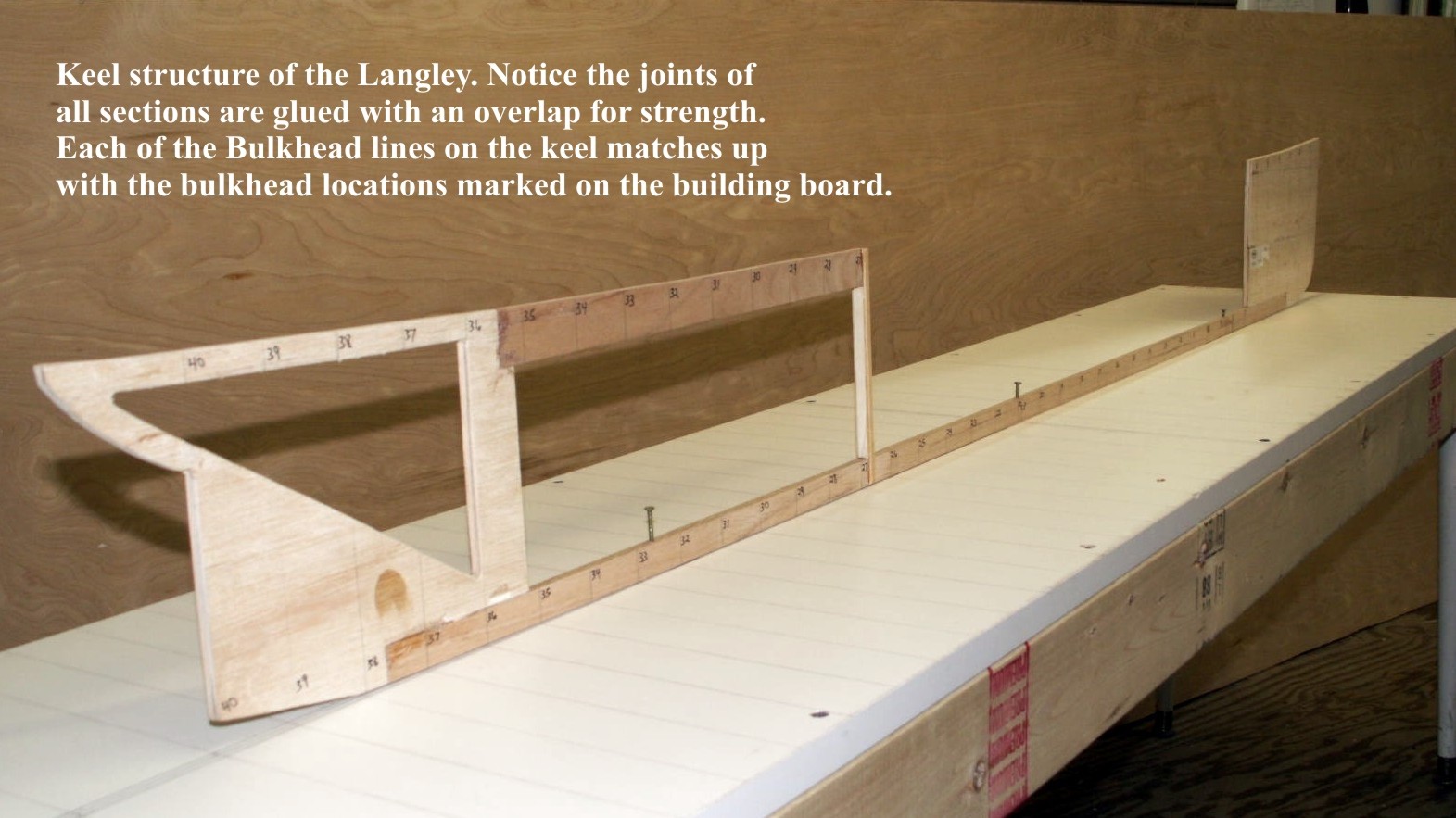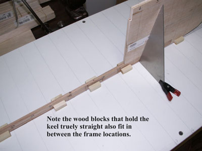 Once all the hull frames and keel parts are cut out, cleaned up, test fitted, and marked/ corrected as appropriate you may now begin the actual assembly of the hull frame. In the case of the Langley I glued a series of wood blocks at intervals along both sides of the building board centerline that would firmly hold the keel in a perfectly straight line, but would not interfere with the frame locations along the keel.