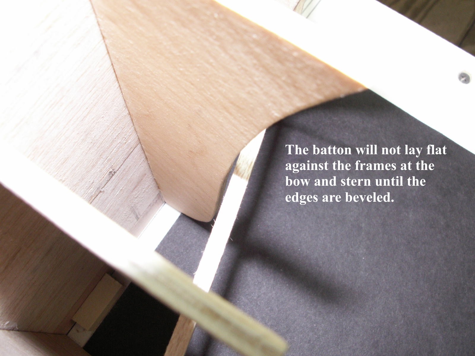 In other cases you may be able to see that a particular frame sticks out farther than the others. It will have to be sanded down to the same level. Frames at the bow and stern will not allow the batten to lie flat on their edges until they are sanded at an angle matching the curvature of the hull.