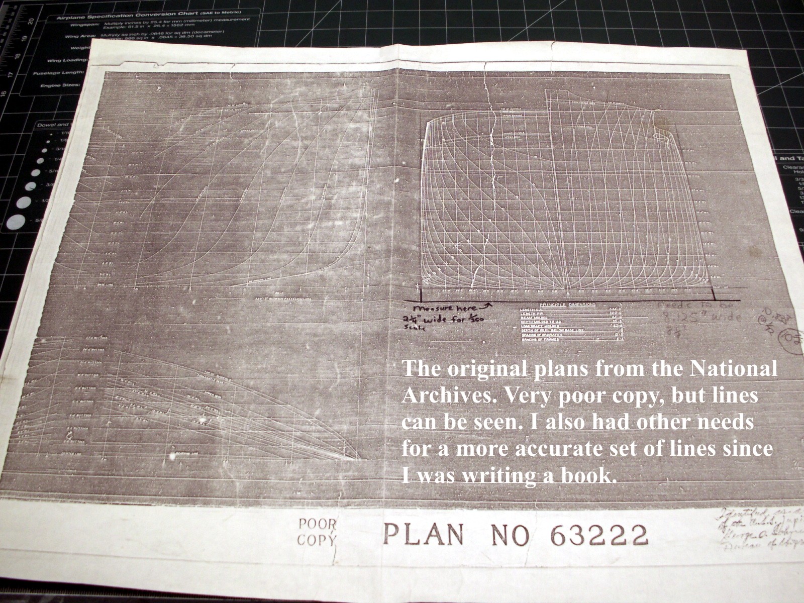 In April of 2008 I decided to start building the only R/C model of the U.S.S. Langley CV-1 that I know of, and since I am also writing a book about the ship's technical history and had all the plans a man could hope for on the ship, I felt building a model should be a piece of cake. Well, as the saying goes, "If you want to make God laugh, just tell him your plans." When I began checking the plans, most of which came from the National Archives, I found several of the aforementioned problems. The first of which was that the cross-sectional views did not match the profile, or "Sheer" plan views when checked with a pair of dividers even though they were drawn on the same page!!! The second problem, which is common, was that the plans were in very bad shape and almost unreadable. The final problem was that when scaling out everything ,the sheer plan not only failed to match the cross-sectional views, but also failed to yield a model of the correct length when laid out. This is a very typical situation for scratch builders, so here's how you fix it.