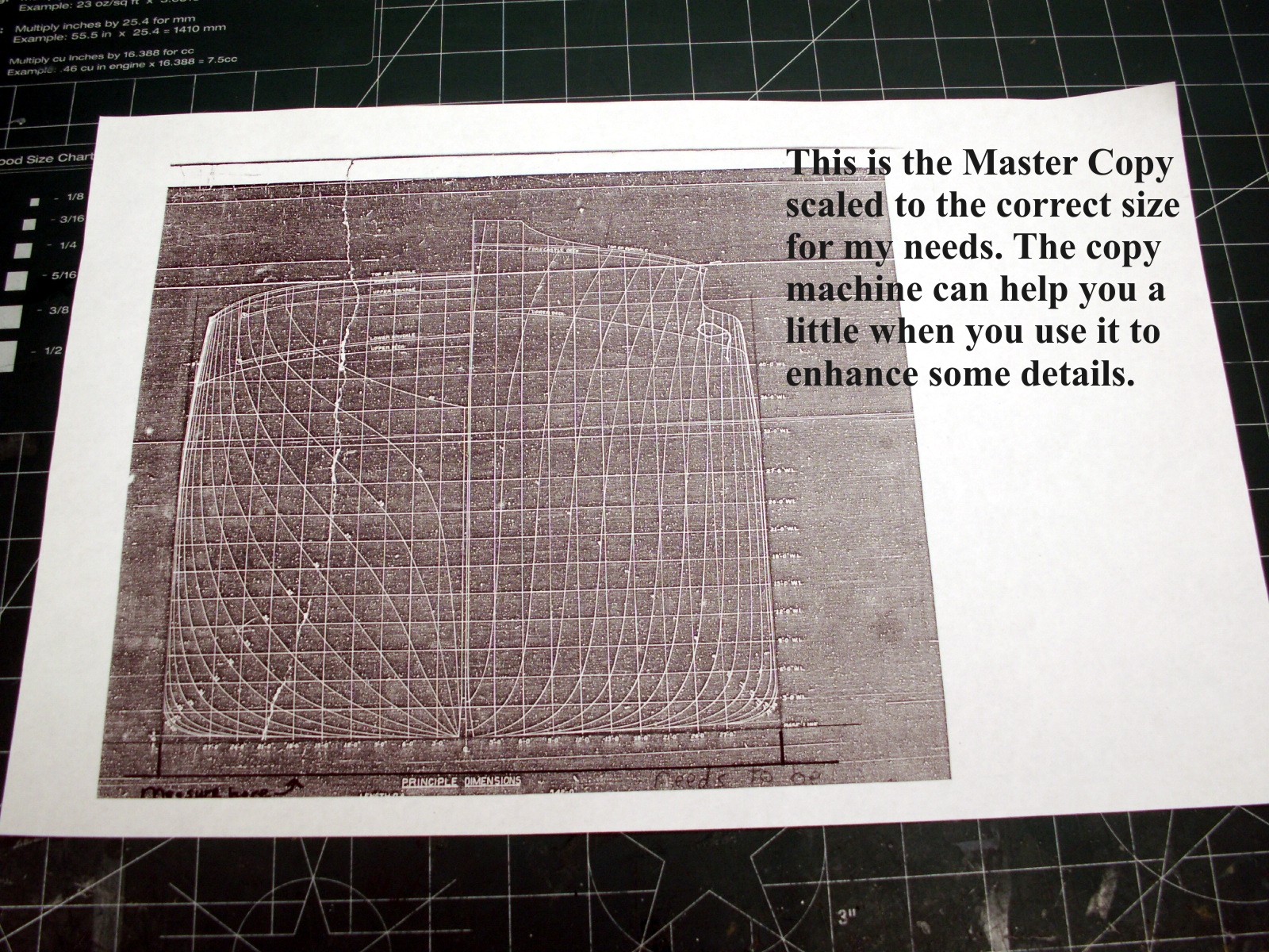 First, make sure that you have all the available information and plans out there about your subject. Assuming you do, get a notepad and start writing down the important information about the ship that the actual Builders put in the plans. Ship's length overall, width, and spacing between the frames, etc. Sometimes the guys who drew the plans will put the spacing between the cross-sections on there as well; in my case it was 13 feet. Also make a note about any special construction details of the ship noted in the plans. Double check that your plans are all correctly scaled to the correct size for the scale in which you are working. You may have to cut the plans apart and have them scaled properly on a copier in order for them to be correct, and each section may actually have to be copied at different percentages.