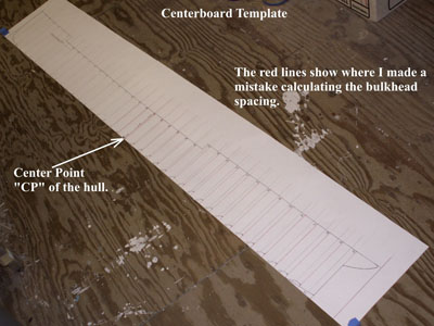 You need to transfer some of the primary reference points of each bulkhead onto the plywood to make sure each bulkhead is exactly the same as its matching template. This includes the line for the extreme width of the hull. You can add whatever other lines and reference points you wish, and it helps if you designate them with other colors of ink Notice that each of these primary lines extends beyond the dimensions of the template. This allows you to see that the template is placed properly on both sides of the vertical centerline. Even a slight offset or miscalculation in distance from any of the Primary Lines will result in a bulkhead that will totally throw off the shape of the hull, so be very accurate at this point. Lay each of your templates on the board, align your reference points, and carefully draw in the bulkhead. Flip the template over and repeat the process. Be sure to number the bulkhead with a bold marker. You should also draw the location of a notch on each bulkhead that is used to connect the bulkhead to the keel/ centerboard.