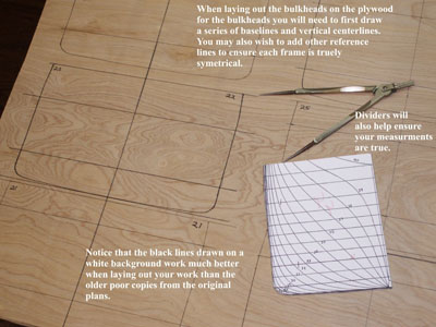 Now that you have a great set of accurate templates for the profile and cross sectional views (bulkheads) you can begin drawing them onto your choice of plywood. First, draw a series of baselines and vertical centerlines on the plywood.