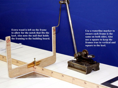 At this point I should say a word on the actual assembly of the hull frame. As you read many articles and opinions on the subject you will find that some people like to leave an extra area of wood attached to the top of each frame. They then attach the frames to the building board upside down, and insert the keel or centerboard into the notches and build the hull upside down. Later they cut off the excess portion of the frames and clean up the sheer line that is now right side up. This is a nice practice and has many advantages, the best perhaps being that it will prevent the hull framing from twisting like a corkscrew as you work on it. Other people build the hull right side up, as I did for the Langley. There are as many opinions about how to assemble the hull as there are people building models, and all are valid if they work. You should proceed with whatever method you are most comfortable with, and by all means, experiment with new ideas and tips from those more experienced than you. Regardless of the assembly method make sure that whatever you do on one side, you repeat for the other so that all torsional stresses are equalized at all times. The biggest problem with framed up models is twisting.
