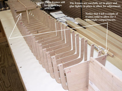 Before any other attachments to the frames can be made, such as stringers that run lengthwise along the frames, some adjustment needs to be made to the frames to ensure a smooth contour of the final product. If you clamp a straight strip of spruce approximately 1/8" X 3/16" X 36" (called a batten) to the frames you can see exactly how true your work is by observing where it touches the frames.