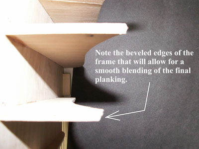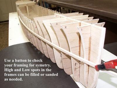 The battens should be used liberally along many different areas of the structure to ensure that all frames are touching at the same level, and to ensure that the hull has a graceful shape that follows what is seen in pictures. The more time you spend faring the frames, the less time you will spend sanding the planked hull - time spent at this step if very worthwhile.
