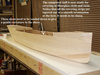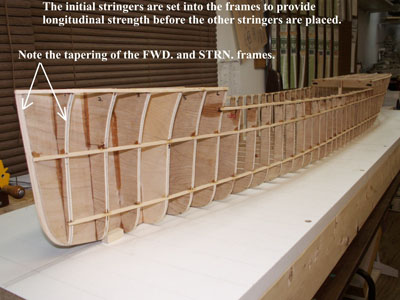 It is important to make this as smooth and graceful as possible. A bar sander of the type that many R/C Model Airplane hobbyists use to build their models is perfect for this. These early sets of stringers will help keep the model's shape true while you continue adding more stringers. One important thing to remember is that all the stringers should follow the natural curve of the hull shape. Don't try to force them to take a certain shape or follow a certain course along the hull.