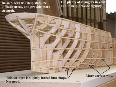Forcing the stringers will only add twisting stresses to the hull that could cause it to distort. Once the stringers are all in place use your sanding bar to smooth out the hull. When you lay a strip of 1"X 1/8" balsa strip on the frame, the same way you did for the batten, it should lie flat against the frame and stringer surfaces. You may need to glue strips of wood onto the framing surfaces in any low spots you find, or sand down high spots you see as you sight down the length of the hull.