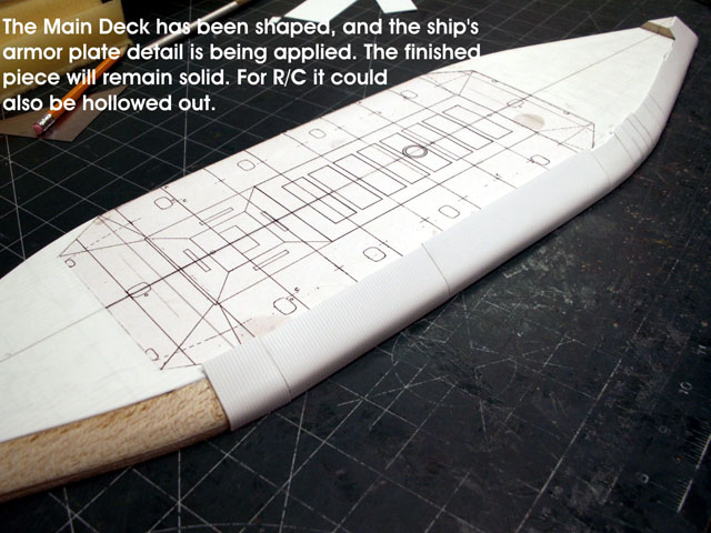 The Main Deck piece will be one solid mass of resin in the final kit. However, before I produce the Lower Hull into a resin copy I will hollow it out. You can see that I have also applied planking to the Lower Hull and simulated armor plates to the Main Deck.