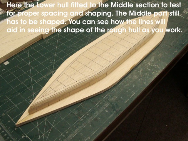 Once you have decided how many sections there will be to the hull you will need to calculate how many lifts of wood will be needed to make up each section. The rule of thumb here is to use more layers of wood as the hull becomes more complex, and has more compound curves. For example, in this case the Lower Hull is not very complex by itself, and measures 15/16" thick from the baseline to the underside of the middle hull. I decided to use ½" thick wood laminated to ¼" laminated to 3 layers of 1/16" thick wood. The thinnest layers were for the bottom of the hull because that is the area on this ship where most of the curves were. The thicker ½" stock was on top where it would join with the middle hull because that part was straight up and down. So you should try to use as many layers of wood as you can as your hull lines become more complex. If I were doing the plug for making a vacuform hull of a lifeboat I would probably use layers of 1/16" wood because that type of hull has many compound curves all along its length.
