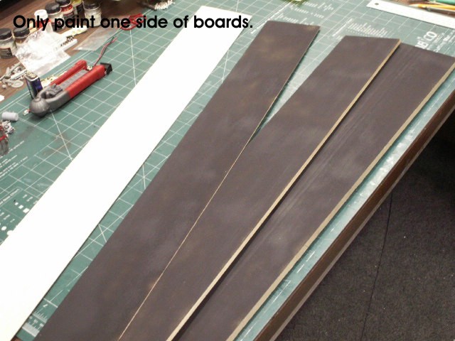 Now figure out which sheets of wood go with each of the sections of hull you want to build. Check them against your plans to make sure they all fit, and will give you enough wood to glue your patterns to with a little extra. Sort them into their appropriate groups, and spray one side of each board with your flat black paint.