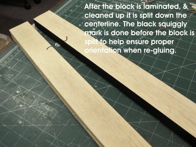 After the glue has dried remove the block from the clamps. This is the point where you need to have access to some wood shop machinery. You need to square up and clean the rough parts and dried glue off the sides and top of the block. Once the block has been trued up you need to mark one end of the block with a pencil across the centerline.