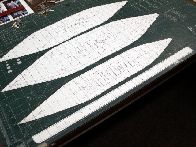 Use your hobby knife to cut out the overhead view of your plans (copies) (we need to cut out the block from the overhead view first, then we will make the profile cut), and make sure you cut outside the lines. You will need one complete overhead cutout for each of the main sections of the hull.