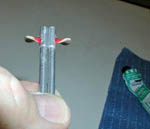 Mix enough JB-Weld so that you get a good 50-50 mixture. Small blades don't take much, but if the epoxy won't cure because the mixture is not right you've got a gooey mess to clean out of the mold. Fill the mold with the JB-Weld mixture and let it set for a minute or two to allow trapped air to escape to the top. Next, insert the crutch SLOWLY into the mold so you don't drag air into the mixture. Make sure that the long end of the wire of the crutch fits into smoothly into the wire-hole left in the mold by the master blade when the mold was made. The tubing of the crutch fits into the space left by the tubing of the master. Hold the top of mold open for a minute to allow any trapped air to escape. Close the mold and squeeze it gently to force out any excess JB-Weld so that the blades cast blades will all be the same thickness. For this application JB-Weld has about a 15 minute working time. Longer than that and air pockets are likely to occur.